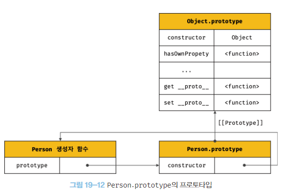 이처럼 객체가 생성되기 이전에 생성자 함수와 프로토타입은 이미 객체화되어 존재한다. 이후 생성자 함수 또는 리터럴 표기법으로 객체를 생성하면 프로토타입은 생성된 객체의 [[Prototype]]내부 슬롯에 할당되며 프로토타입을 상속받는다.