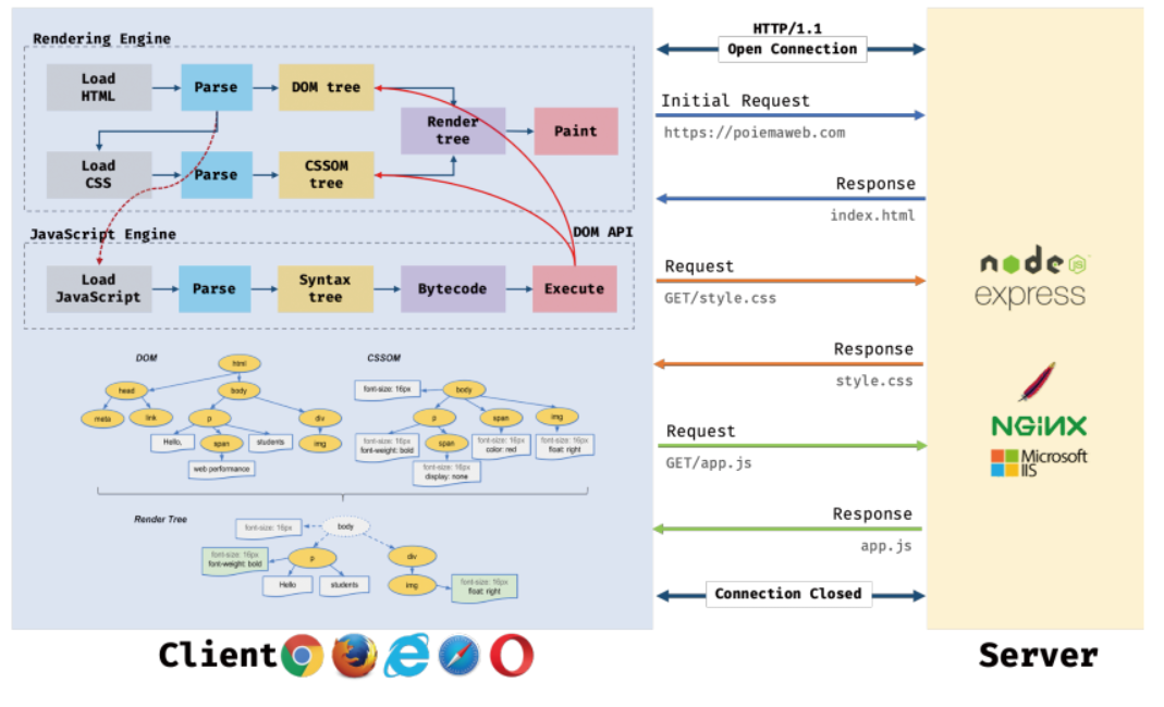 2. 브라우저의 렌더링 엔진은 서버로부터 응답된 HTML과 CSS를 파싱하여 DOM과 CSSOM을 생성하고 이들을 결합아여 렌터 트리를 형성한다.